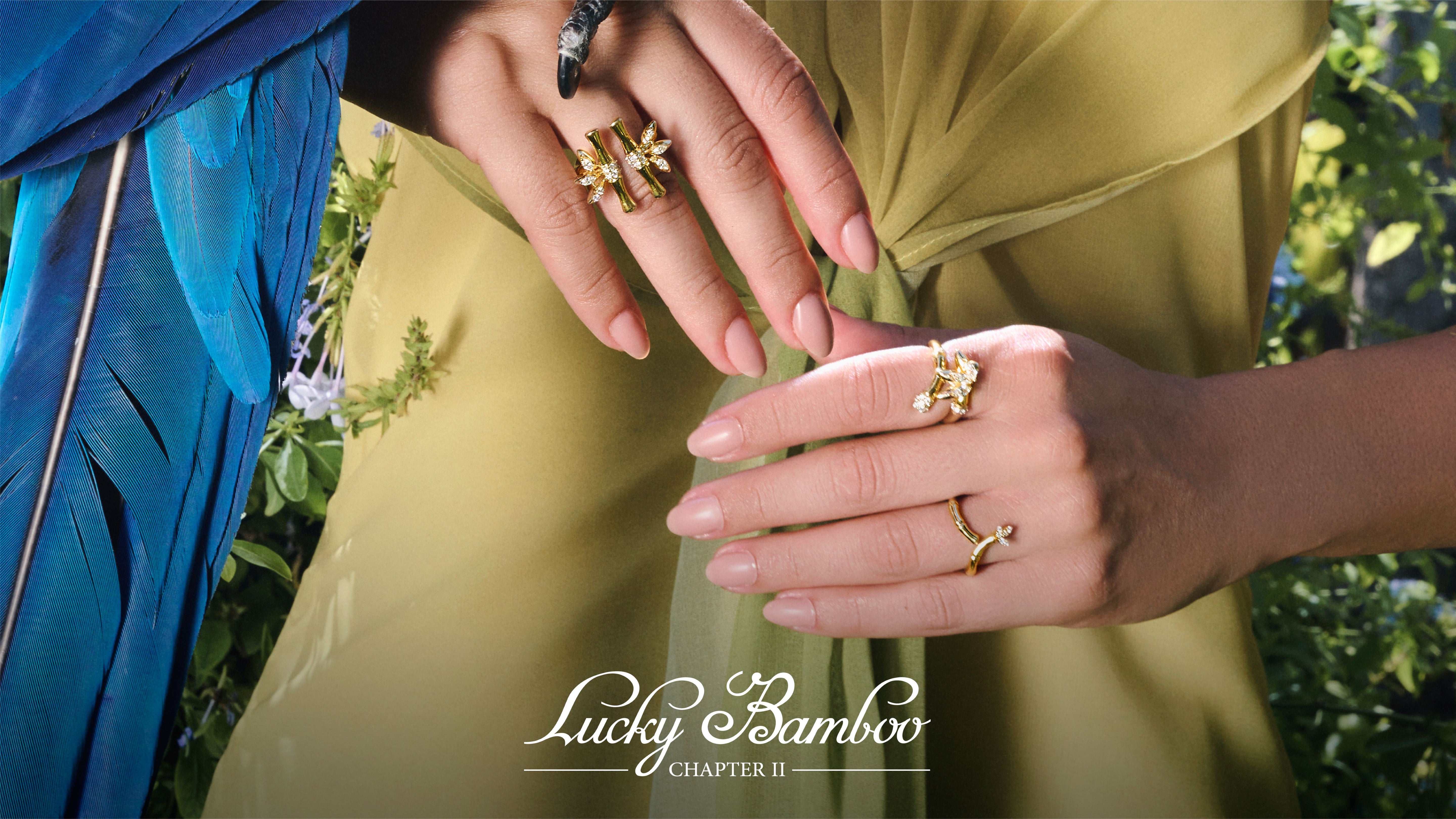 18K Yellow gold Lucky Bamboo Ring with Diamond Leaves - S-R446SB
